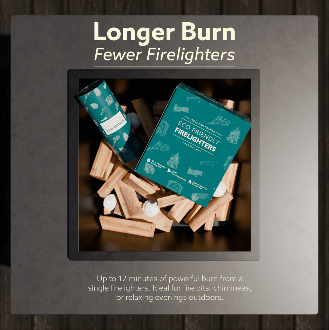 - Powerful, Long-Lasting Burn: A single firelighter is all it takes, thanks to our 12-minute burn time.